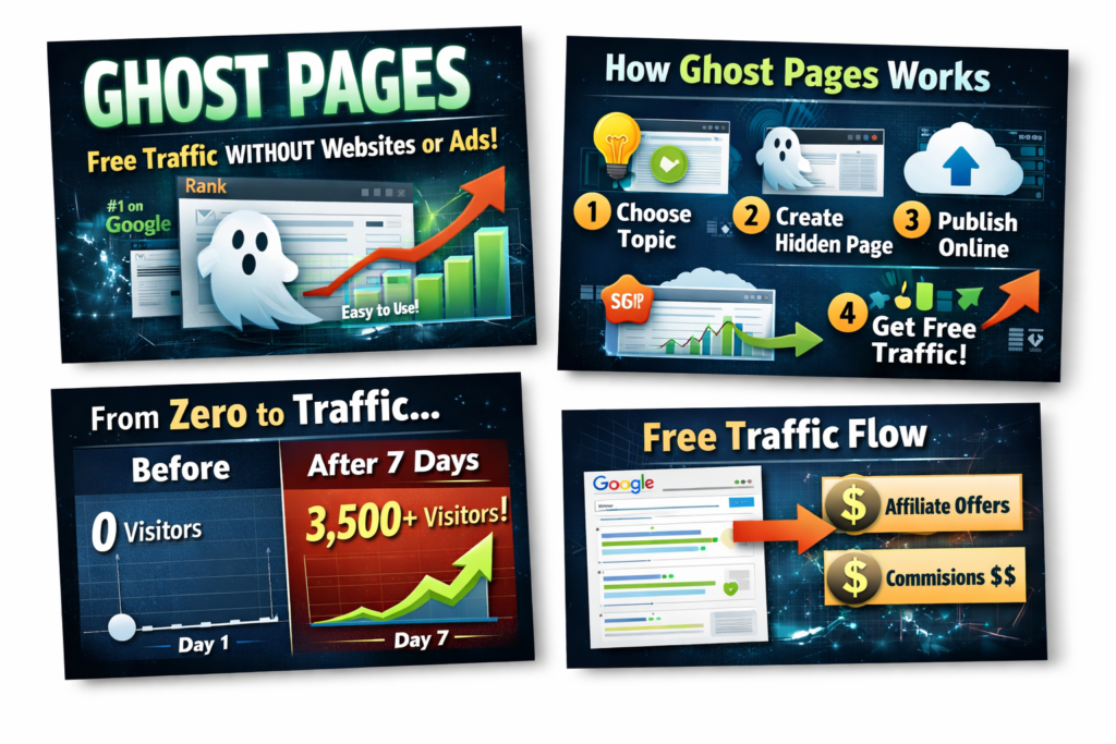 Ghost Pages is presented as a traffic-generating system that lets you create “invisible” web pages—Google-friendly but hidden from competitors. Key selling points include: